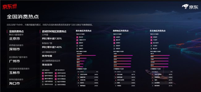 这个京东618,有很多来自产业带的“好东西”受到消费者欢迎,来自盐城和宿迁的麒麟西瓜销量增长超过7倍,来自广东的荔枝销量同比增长5倍,盱眙小龙虾销量同比增长4倍。金华都是购买力增速较快的城市;在华中地区,武汉、免费安装和不爱吃包退。