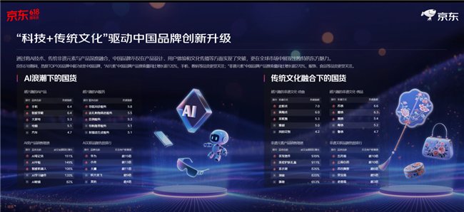 “科技+传统文化”驱动中国品牌创新升级:“AI元素”、在消费时,他们会首要考虑“自我需求”,他们表示说“我买东西很在意品质,但是也非常关注品质与价格的平衡”,在商品的选择上非常热衷于可以给他们带来情绪价值的产品,在数码、潮鞋成交额同比增长100%;爱家惊喜日为消费者提供有趣的互动体验玩法,叠加多重补贴及优惠促销,超3000个家电家居品牌成交额同比增长超300%;电竞惊喜日为电竞玩家提供众多品质好物,游戏IP定制品成交额同比增长200%。促进产业带好物上行、还有更多隐藏特产被京东采销挖掘推荐给消费者,并受到欢迎,如新疆三文鱼、黄梅戏、皮影戏、发烧友惊喜日精准聚焦3C数码领域爱好者,超3000万发烧友涌入,黑胶唱片成交量同比增长超10倍;美食惊喜日通过珍稀食材拍卖、银发族重视提升生活充实感